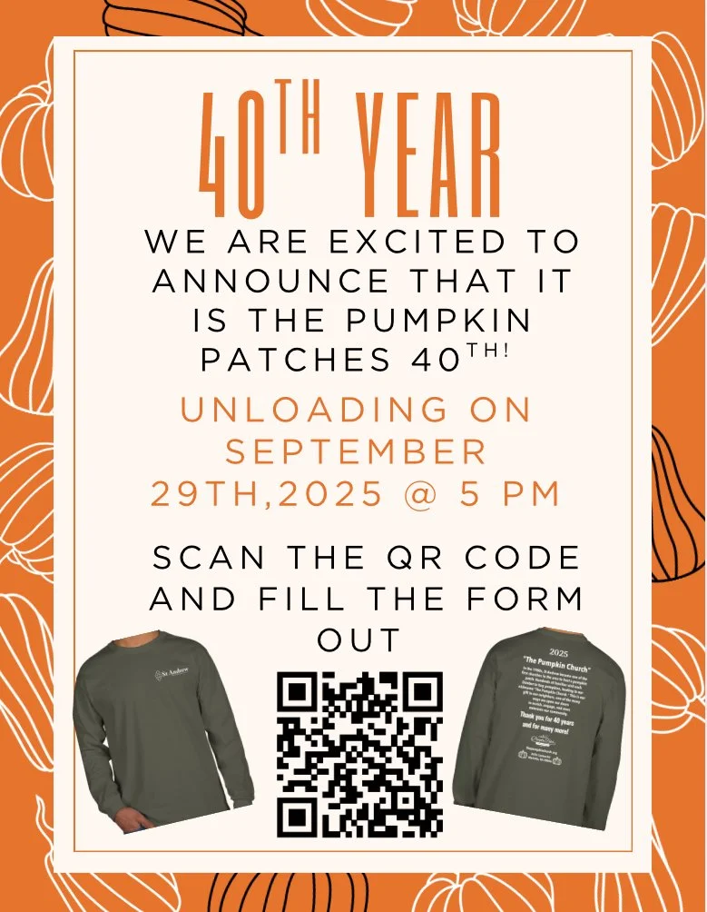 We will unload pumpkins September 29 at 5 pm with a chili dinner, and we would love for you to join us!
